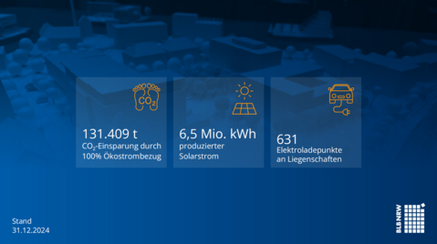 Zugleich leistet der BLB NRW mit seiner Arbeit einen wesentlichen Beitrag zur Erreichung der baupolitischen Ziele des Landes, etwa in Sachen Klimaschutz. So beschafft der BLB NRW seit 2015 für die gesamte NRW-Landesverwaltung Ökostrom.