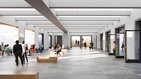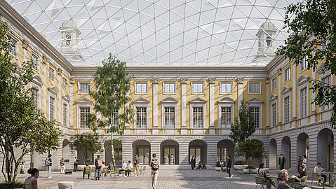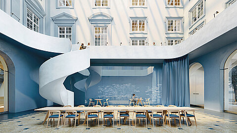und des Arkadenhofes als zentrale Idee ihres Entwurfes. Der Hof soll als ein transformiertes, öffentliches Herz, eine atmosphärische und organisatorische neue Mitte schaffen."