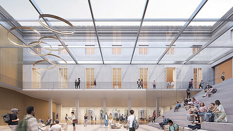 Zum 3. Platz für Staab Architekten führt das Preisgericht aus: "Die vorgeschlagene leichte Überdachung des Arkadenhofs soll als luftiges, dennoch gedecktes Entree der Universität fungieren. Gleichzeitig wird ein interessanter Schritt auch im Erdgeschoss vollführt, indem der westliche Bereich von Foyer und Lichthof zur Aula, also zum festlichen Mittelpunkt der Anlage, umgewidmet wird. Dieses neue Angebot an kommunikativen Raum bildet die Stärke der Arbeit."
