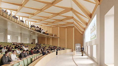 Aus der Jurybegründung für den 1. Platz für KNERER UND LANG ARCHITEKTEN heißt es unter anderen: "Kernstück des Entwurfs ist der Erhalt der Aula im 1. Obergeschoss als zentralem Raum, der durch den rückwärtig ergänzten großen Hörsaal eine funktionale Erweiterung erfährt. [...] Entsteht doch ein neues zentrales Herz – ein bislang fehlender „Dritter Ort“, der Raum für vielfältige Veranstaltungen auch außerhalb der Hörsäle bieten kann und so das soziale und akademische Leben bereichert." Zusammenfassend heißt es: "Insgesamt bietet die Arbeit eine schlüssige und überzeugende Antwort auf die Frage, wie die Hauptgebäude der Universität Bonn zurückhaltend, angemessen, zugleich jedoch hochwertig und architektonisch bereichernd saniert und erweitert werden können."