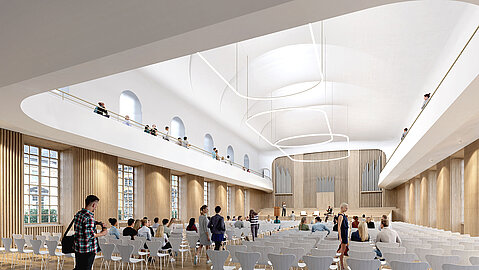 In der Anerkennung für asp Architekten schreibt die Jury unter anderem: "Gleichzeitig wird ein interessanter Schritt auch im Erdgeschoss vollführt, indem der westliche Bereich von Foyer und Lichthof zur Aula, also zum festlichen Mittelpunkt der Anlage, umgewidmet wird. Dieses neue Angebot an kommunikativen Raum bildet die Stärke der Arbeit."