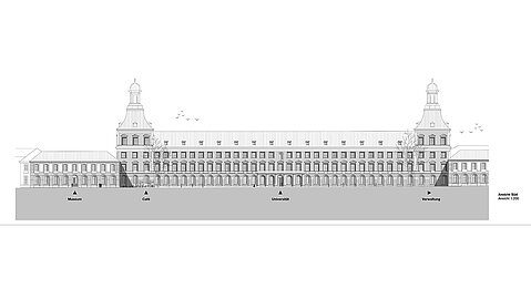 Neue Ideen für das Bonner Schloss: Das barocke Hauptgebäude der Universität Bonn entspricht nicht mehr den Anforderungen an ein zeitgemäßes, den Ansprüchen moderner Lehre entsprechendes Universitätsgebäude. Das Schlossensemble ist sanierungsbedürftig und soll ab 2029 grundlegend restauriert werden. Es wird dafür vollständig geräumt. In einem Wettbewerb wurden Vorschläge für die anstehende Neustrukturierung und Kernsanierung gesammelt und bewertet.